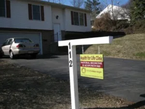The Clinic is 2 houses down on the left (white house with red shutters and bright green clinic sign out front)